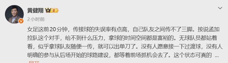 知名解说员黄健翔表示:女足这前20分钟,传接球的失误率有点高,自己队友之间传不了三脚。按说孟加拉队这个对手,给不到什么压力,拿球的时间空间都是富裕的。无球队员都站着看,似乎拿球队友随便一传,就可以出单刀了,没有人愿意接一下过渡球,这个状态可真的不是太好。